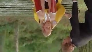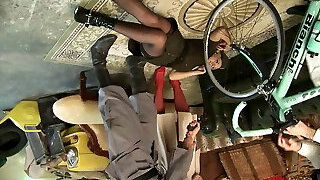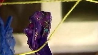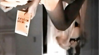 Housewife laid out sexy undergarments and outfits on the bed. She tries on panties, corsets, bras, socks, stocking, tights, peignoir. 1