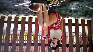 Cute MILF in red stocking without undies shows pussy and ass. Red corset, stockings with garters.
